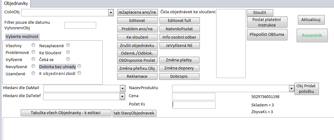 Podmínka byla cenrální evidence objednávek, cenrální sklad, aktualizace s www stránkami eshopů, import objednávek ze platformy https://www.eshop-rychle.cz/.