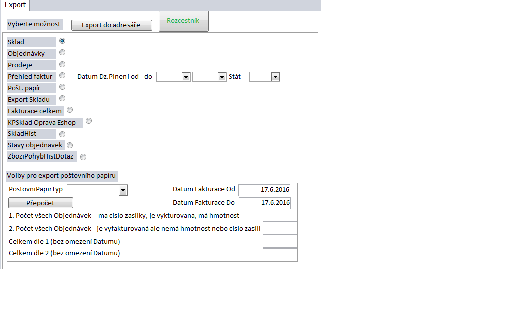 Řeší se přehledy a exporty všech potřebných informací - pro poštu, pro účetnictví, statistika prodejů na úrovni produktu a času,...
